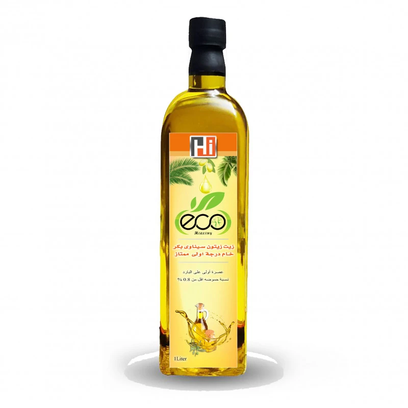 Eco Healthy Sinai olive oil, transparent glass, 1 liter, the acidity rate is less than 0.08%, the best types of natural oils extracted from the best types of olives, wonderful taste, olive oil is indispensable on your trip, packed automatically without the intervention of hands to preserve the health of your family
